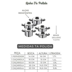 Modelo: Conjunto aluminio forte com tampa, Modelo com cordões em alumínio na altura de cada boca da panela o que gera uma estabilidade maior na peça, contém também extensões nas alças que evitam o contato com o fogo e as preservam por mais tempo, além destes detalhes ainda conta com tampa em todos os itens. Quantidade de peças:5. Tamanho das peças: Caldeirão nº 14 Caçarola nº 16 Caçarola nº 18 Caçarola nº 20 Caçarola nº 22