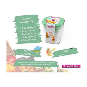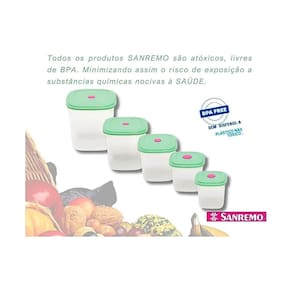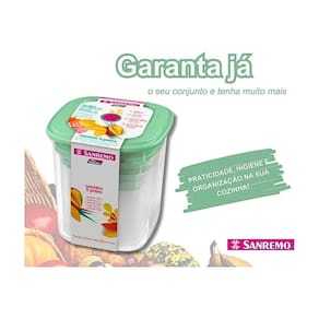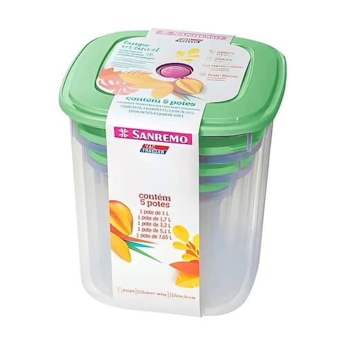 Conjunto 5 Potes Quadrados Verde Plástico Sanremo 490/2C Conjunto de cinco potes que vai facilitar a sua vida na cozinha: cada peça possui design moderno e é extremamente funcional: os cantos arredondados facilitam a limpeza, as alças ajudam no manuseio - principalmente com alimentos quentes -, e o formato da base evita que crie vácuo para não ficar grudado em superfícies molhadas. Você merece Vac Freezer na sua vida.