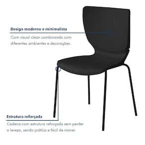 Receber bem nunca foi tão prazeroso! Nosso conjunto de cadeira une conforto, estilo e durabilidade para transformar seus momentos à mesa em verdadeiras experiências. Com encosto ergonômico, ela proporciona o suporte ideal para as costas, perfeita para longas refeições e boas conversas. Seu design se adapta facilmente a diversos estilos de decoração, do clássico ao contemporâneo. Produzida com materiais de qualidade e tratamento anti UVA, resiste ao tempo e à exposição solar sem perder a cor ou o charme. Ideal para quem busca sofisticação e bem-estar em todos os detalhes. Qual o benefício de uma cadeira com encosto confortável? Mais apoio para as costas e conforto prolongado à mesa. Qual a vantagem da cadeira com estrutura tubular? A base tubular oferece durabilidade e um visual moderno. Acabamento da Estrutura: Pintura Altura do assento até o chão: 43 cm Altura dos Pés: 43 cm Altura Máxima dos Pés: 43.0000 Ambiente Principal: Cozinha codigo_ean: 7900288186188 Cor: Preto Cor do Produto: Preto Dobrável: Não Escala de Brilho: Semi-Brilho Estrutura do Assento: Polipropileno Estrutura do Encosto: Polipropileno Giratória: Não Informações Complementares: Por se tratar de produto injetado, pequenas variações de tonalidade de cor são intrínsecas ao produto, e não podem ser consideradas defeito. Para aprimoramento de projeto, os produtos podem sofrer modificações. Itens Inclusos: 6 Cadeiras Linha ou Coleção: Mono Manual de Montagem e Instalação: https://product-hub-prd.madeiramadeira.com.br/554998606/documents/7d4484a4-dd96-4e0e-b1bb-8e2c0aa4224b303703873217513859758845.pdf Marca: Prima Design Material da Base: Aço Material Principal: Aço Necessita Montagem: Não Origem do Produto: Nacional Peso: 3,6 kg Possui Apoio para Braços: Não Possui Rodízio: Não Quantidade de Itens: 6 Recomendações de Uso, Manutenção e Limpeza: A estrutura deve ser limpa utilizando pano seco de algodão ou flanela. Se necessário, utilize panoumedecido apenas com água, secando o móvel em seguida.Não utilize solvente, álcool, acetona, lustra móveis, produtos abrasivos e outros produtos que contenhamsoda e ou ácidos para limpar e tirar manchas dos móveis.Não expor os móveis à luz solar e ambientes com umidade relativa elevada.Manter a estrutura metálica limpa, utilizando pano seco ou cera a base de silicone. Tipo de Assento: Fixo Tipo de Encosto: Fixo Marca: Não Informado