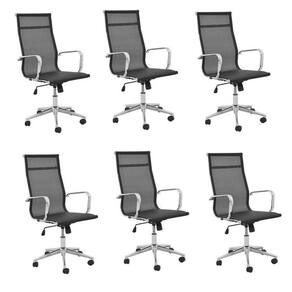 Conjunto com 6 cadeiras de escritório com estrutura em aço, revestimento em tela mesh, com encosto alto. Possui base giratória em aço cromado e rodízios em nylon. Possui ajuste de altura (mínimo 105cm e máximo 115cm) e sistema relax. Altura do Conjunto: 105 cm Ambiente: null Ambiente Principal: Escritório Cor: Preto Informação Complementar: 1x Kit 2 Cadeiras de Escritório Presidente Giratória Office Sevilha Alta Tela Preto Largura: 56 Altura: 105 Peso: 10.2 Profundidade: 59 Necessita Montagem: Sim