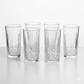 ESPECIFICAÇÕES TÉCNICAS Dimensões do copo: 13 cm (altura) x 7 cm (largura) Material: Vidro Capacidade individual: 280ml Quantidade de peças: 6 unidades Transparente Peso do conjunto: 1,938 kg Textura: Relevo geométrico na base