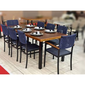 Faz parte do anúncio: 1 Mesa de Madeira Maciça 2,0x0,90m - Athenas - Paonanda Decor 6 Cadeiras Metálicas - Madri - Paonanda Decor 2 Cadeiras Metálicas com Braço - Madri - Paonanda Decor Obs.: Não acompanha objetos decorativos. Indicado para uso em áreas internas e semi-abertos, LIVRES DE CHUVA