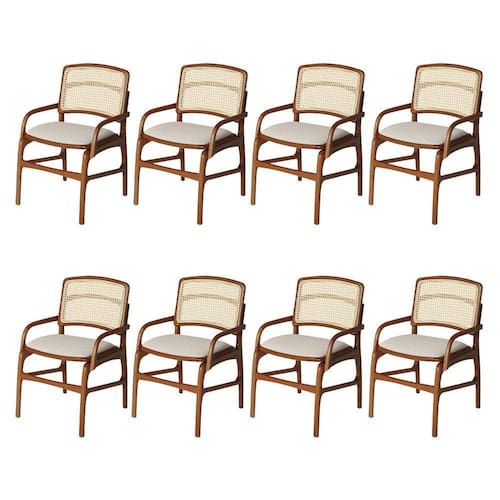 AS IMAGENS SÃO MERAMENTE ILUSTRATIVAS E PODEM SOFRER VARIAÇÕES DE COR E PEQUENOS DETALHES DE ACORDO COM O SEU MONITOR, ILUMINAÇÃO DO AMBIENTE E ATÉ MESMO A SUA PERCEPÇÃO VISUAL.Conjunto 8 Cadeiras de Cozinha FlorenÃa em Madeira Jequitibà Terra BraÃo Encosto Palha Linho Bege