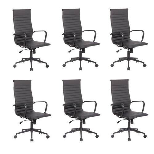 A Cadeira Sevilha já é queridinha do design e garante que seu espaço de trabalho e estudos seja confortável e funcional. Seus detalhes em aço preto dão o toque diferente que seu ambiente merece! Design contemporâneo que agrega elegância e estilo para o seu dia a dia. Conjunto com 8 Cadeiras de escritório com estrutura em aço pintado à pó preto, revestimento em poliuretano (PU), com encosto alto. Possui base giratória em aço pintado à pó preto e rodizíos em nylon. Possui ajuste de altura (mín 105cm e máx 115cm) e sistema relax. Altura do Conjunto: 105 cm Ambiente: null Ambiente Principal: Escritório Cor: Preto Informação Complementar: 2x Conjunto 4 Cadeiras de Escritório Presidente Sevilha Alta com Base Office PretoLargura: 60 cmAltura: 105 cmPeso: 10,7 kgProfundidade: 60 cmNecessita Montagem: Sim Possui Rodízio: Sim Suporta Até (kg): 120 kg