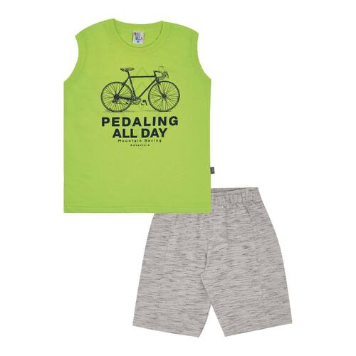O conjunto ideal para os meninos se aventurarem de bike no parquinho! A regata confeccionada em tecido meia malha na cor abacate com estampa frontal de uma bike e escrita "Pedaling All Day/Moutain Racing"* e a bermuda na cor mescla cinza é confeccionada em moletom jet. O conjunto é prático e ideal para o dia da dia da garotada! *Tradução: "Aventura de corrida de montanha/pedalando o dia todo".
