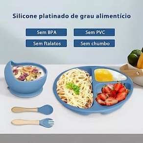 O prato de silicone possui 3 compartimentos para manter os alimentos separados e uma ventosa na parte inferior, evitando quedas e deslizamentos.