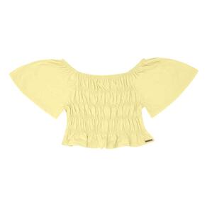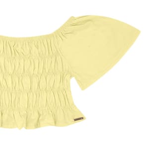 Prontas para um passeio especial? Preparamos o conjunto fashion para as meninas, a blusa no modelo cropped é confeccionada em meia malha na cor amarela e possuí placa de metal com identificação Pulla Bulla próximo da cintura. Já o short saia jeans na cor índigo médio possuí pregas e botão frontal. As peças podem ser usadas separadamente, aumentando assim sua versatilidade.