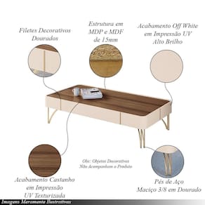 Mesa de Centro Largura: 132 cm Altura: 31 cm Profundidade: 66 cm Peso: 18,75 Kg Característica dos Produtos: Estrutura Aparador: MDP e MDF de 25mm e 15mm