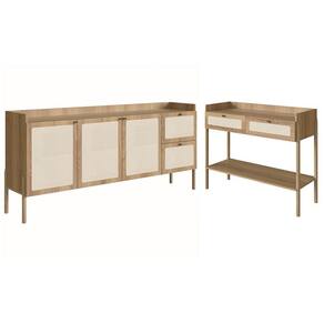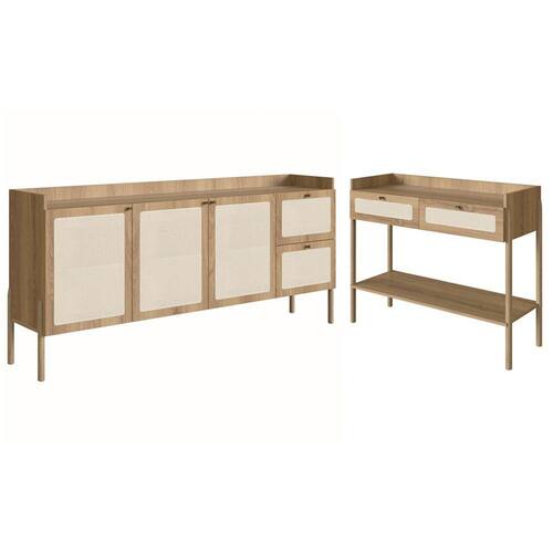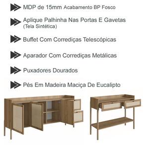 Conjunto Aparador e Balcão Buffet, Linha Oslo Artesano. Traz como característica um traço artesanal, suave, acolhedor e sofisticado. Estrutura em MDP de 15mm e pés palitos em madeira maciça de eucalipto garantindo ótima estabilidade e firmeza, acabamento em pintura BP na cor Hanover (Fosco), costas em HDF 3mm com acabamento na cor branco. Portas com dobradiças metálicas com proteção anticorrosão, balcão buffet com 02 gavetas com corrediças telescópicas garantindo um abre e fecha leve e suave, e aparador com 02 gavetas com corrediças metálicas simples, puxadores de poliestireno na cor Dourado, aplique palhinha de tela sintética (PVC com poliéster), fixada na parte externa das portas e gavetas, as extremidades dos pés possuem sapatas emborrachadas para evitar atrito do móvel com o piso, afim de evitar acidentes, móveis com design escandinavo minimalista, é a opção ideal para um ambiente com toque sofisticado e ao mesmo tempo aconchegante. Mais produtos da Linha Oslo, você encontra em nosso site, podendo fazer a composição completa para sua casa, são diversos itens com design prático e funcional para tornar a vida mais facil e a casa mais alegre. Estes móveis chegarão em sua casa separados em 04 volumes.