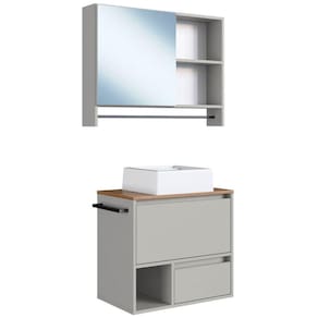 Conjunto Armário e Gabinete com Cuba, feito para oferecer modernidade e funcionalidade ao espaço. Estrutura em MDP/MDF com acabamento em pintura UV texturizada. Possui toalheiros (em aço com pintura epóxi), nichos decorativos, porta basculante invertida com sistema de pistão a gás, abertura tipo cava, gavetão com corrediças telescópicas, porta com espelho integrado, prateleiras internas e cuba retangular em mármore sintético. Fixação por meio de parafusos. Este produto será entregue em 3 volumes.