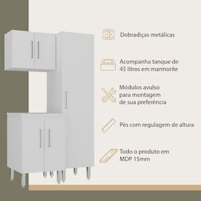 O Conjunto Armários de Lavanderia com Gabinete e Tanque 45L Multimóveis CR30041 é uma solução pratica para lavanderias. Produzido em MDP de 15mm com acabamento semibrilho, que garante maior durabilidade e facilidade de limpeza. É composto por três módulos: armário auxiliar, armário aéreo e balcão com tanque de 45L - todos com amplo espaço interno. Os pés com regulagem de altura facilitam o nivelamento dos módulos e a limpeza do ambiente. Ideal para quem busca organizar espaços pequenos.