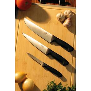 O Conjunto Assador 3 Peças Mor vem com três facas de tamanhos diferentes para facilitar na hora do preparo daquele prato especial. Uma para cada ocasião. Fabricados com cabos em polipropileno preto e lâminas em aço inoxidável, são resistentes e práticas, essenciais para descomplicar a rotina de qualquer cozinha.