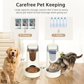- Conjunto com 2 alimentadores automáticos – o pacote vem com 1 dispensador de água e 1 alimentador de alimentos, que são adequados para gatos ou cães pequenos e médios.