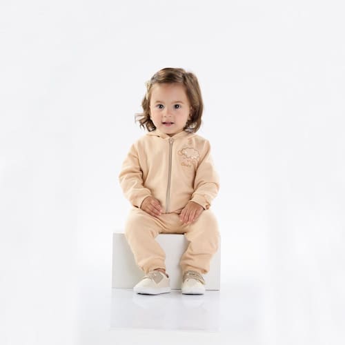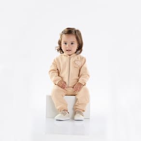 Estiloso e muito confortável, o conjunto em moletom na cor avelã conta com jaqueta que possuí capuz e fecho frontal, o detalhe destaque da peça é o bordado de ovelha na frente da jaqueta. A calça conta com elastano na cintura e seu detalhe fica para o bordado de ovelha na parte das costas da calça.\n