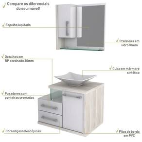 Sobre o ProdutoConjunto Balcão C/Cuba L38 e Espelheira Legno 650 Branco ChessDescrição do Produto:O Conjunto (Balcão + Cuba + Espelheira) Legno KTLG650 é um produto compacto, de design contemporâneo e minimalista, projetado para se encaixar no seu espaço, composto por um gabinete com cuba de apoio, 02 gavetas laterais e detalhe em vidro 10mm. A espelheira possui 01 porta, espelho lapidado e 01 prateleira de vidro 10mm, sendo perfeita para organizar suas coisas e fazer parte da decoração do seu linha Legno combina a leveza do branco e detalhes em vidro com tons amadeirados, conferindo uma personalidade contemporânea aos móveis de design minimalista e traços retos. Produtos que aliam funcionalidade e praticidade ao seu dia a dia são características marcantes desta coleção!Itens Inclusos:1 Conjunto Balcão C/Cuba e EspelheiraDimensões dos Produtos:Gabinete: 65 x 45 x 50 cmEspelheira: 59 x 15 x 54 cmCuba 38,5 x 33 x 11,5 cmInformações Logísticas (Comp. X Prof. X Alt.) 70 x 50 x 56 cm - Peso: 25,75 63 x 19 x 59 cm - Peso: 9,065 KgPeso Total: 34,815 KgObservações:Não acompanha acessórios decorativos. Imagens meramente ilustrativas.Informações Técnicas / Características:- Cor do Produto: Branco Chess- Cor do Predominante: Branco- Marca: Compace- Modelo: KTLG650- Linha: Legno- Material: Mdp - Acabamento: Perffect Acetinado- Escala de Brilho: Fosco- Fita de Borda: Pvc- Possui Portas: 2- Tipo de Porta: Bater- Tipo da Dobradiça: Metálica- Possui Gavetas: 2- Tipo da Corrediça: Telescópica- Possui Chave: Não- Peso Máximo por Gaveta: 3 kg- Material do Puxador: Abs- Possui Prateleiras: 1- Peso Máximo por Prateleira: 1 kg- Possui Pés: Não, suspenso - Possui Espelho: Sim- Possui Vidro: Sim- Acompanha Cuba / Lavatório: Sim, de Mármore Sintético- Furação para Cuba / Lavatório: Não- Tipo da Cuba: Apoio- Cor da Cuba: Branca- Suporta Até (kg): 20 kg - Peso Lí.: 31,82Kg- Recomendações de Uso, Manutenção e Limpeza: Para a limpeza, utilize flanela seca ou pano macio levemente umedecido em água. Utilize um pano seco em seguida. Evite com produtos químicos (solventes, thinner, acetona, etc) e não utilize nenhum tipo de esponja de aço.- Necessita de Montagem: Sim / Acompanha Manual de Montagem- Complexidade da Montagem: Média: pode ser montado por mais de uma pessoa e/ou necessite de maior conhecimento para montagem.- Garantia: 6 meses Material: Mdp | Acabamento: Perffect Acetinado | Escala de Brilho: Fosco | Fita de Borda: Pvc | Possui Portas: 2 | Tipo de Porta: Bater | Tipo da Dobradiça: Metálica | Limite de unidades por venda: É possível comprar até 1 unidade por venda. | Comprimento: 65 | Quantidade máxima de pedido: 1 | Largura: 42 | Altura: 19 | Profundidade: 42 | Preço tabelado: 620 | Cor: Multicolorido | Certificação de teste externa: Não Aplicável | Baterias são necessárias?: false | Palavras-chave de Pesquisa: Não aplicável | Fonte de energia: Não aplicável | Fabricante: Compace | Exige montagem: | Componentes incluídos: | da peça: | Peso do item: | Dimensões do item P x L x A: | Is Fragile: | Principais Características do Produto 2: | Principais Características do Produto 1: | Principais Características do Produto 0: | Quantidade de itens: | do modelo: | de caixas: Cor: Branco Chess C/Snow