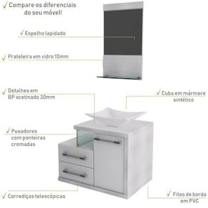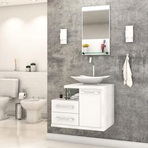 Sobre o ProdutoConjunto Balcão C/Cuba L38 e Espelheira Legno 651 Branco ChessDescrição do Produto:O Conjunto (Balcão + Cuba + Espelheira) Legno KTLG651 é um produto compacto, de design contemporâneo e minimalista, projetado para se encaixar no seu espaço, composto por um gabinete com cuba de apoio, 02 gavetas laterais e detalhe em vidro 10mm. A espelheira possui espelho lapidado e 01 prateleira de vidro 10mm, sendo perfeita para organizar suas coisas e fazer parte da decoração do seu linha Legno combina a leveza do branco e detalhes em vidro com tons amadeirados, conferindo uma personalidade contemporânea aos móveis de design minimalista e traços retos. Produtos que aliam funcionalidade e praticidade ao seu dia a dia são características marcantes desta coleção!Itens Inclusos:1 Conjunto Balcão C/Cuba e EspelheiraDimensões dos Produtos:Gabinete: 65 x 45 x 50 cmEspelheira: 37,5 x 11,5 x 67,5 cmCuba 38,5 x 33 x 11,5 cmInformações Logísticas (Comp. X Prof. X Alt.) 70 x 50 x 56 cm - Peso: 30,03 KgPeso Total: 30,03 KgObservações:Não acompanha acessórios decorativos. Imagens meramente ilustrativas.Informações Técnicas / Características:- Cor do Produto: Branco Chess- Cor do Predominante: Branco- Marca: Compace- Modelo: KTLG651- Linha: Legno- Material: Mdp - Acabamento: Perffect Acetinado- Escala de Brilho: Fosco- Fita de Borda: Pvc- Possui Portas: 1- Tipo de Porta: Bater- Tipo da Dobradiça: Metálica- Possui Gavetas: 2- Tipo da Corrediça: Telescópica- Possui Chave: Não- Peso Máximo por Gaveta: 3 kg- Material do Puxador: Abs- Possui Prateleiras: 1 - Possui Pés: Não, suspenso - Possui Espelho: Sim- Possui Vidro: Sim- Acompanha Cuba / Lavatório: Sim, de Mármore Sintético- Furação para Cuba / Lavatório: Não- Tipo da Cuba: Apoio- Cor da Cuba: Branca- Suporta Até (kg): 20 kg - Peso Lí.: 27,95Kg- Recomendações de Uso, Manutenção e Limpeza: Para a limpeza, utilize flanela seca ou pano macio levemente umedecido em água. Utilize um pano seco em seguida. Evite com produtos químicos (solventes, thinner, acetona, etc) e não utilize nenhum tipo de esponja de aço.- Necessita de Montagem: Sim / Acompanha Manual de Montagem- Complexidade da Montagem: Média: pode ser montado por mais de uma pessoa e/ou necessite de maior conhecimento para montagem.- Garantia: 6 meses Material: Mdp | Acabamento: Perffect Acetinado | Escala de Brilho: Fosco | Fita de Borda: Pvc | Possui Portas: 1 | Tipo de Porta: Bater | Tipo da Dobradiça: Metálica | Limite de unidades por venda: É possível comprar até 1 unidade por venda. | Tipo de Produto: Gabinete de banheiro | Fabricante: Compace | Quantidade máxima de pedido: 1 | Comprimento: 65 | Largura: 45 | Altura: 53 | Profundidade: 45 | Preço tabelado: 549 | Cor: Multicolorido | Certificação de teste externa: Não Aplicável | Baterias são necessárias?: false | Palavras-chave de Pesquisa: Não aplicável | Fonte de energia: Não aplicável | Peso do item: | Componentes incluídos: | Principais Características do Produto 2: | Exige montagem: | da peça: | Principais Características do Produto 1: | Dimensões do item P x L x A: | Is Fragile: | Principais Características do Produto 0: | Quantidade de itens: | do modelo: | de caixas: Cor: Branco Chess C/Branco Chess