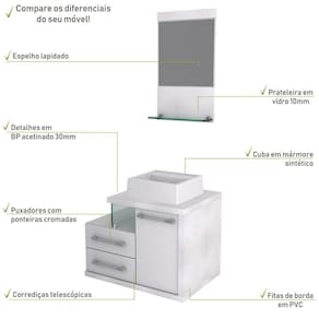 Conjunto Balcão C/cuba Q32 E Espelheira Legno 651 Perffect Acetinado Branco Chess C/branco Chess Sobre o ProdutoConjunto Balcão C/Cuba Q32 e Espelheira Legno 651 Branco ChessDescrição do Produto:O Conjunto (Balcão + Cuba + Espelheira) Legno KTLG651 é um produto compacto, de design contemporâneo e minimalista, projetado para se encaixar no seu espaço, composto por um gabinete com cuba de apoio, 02 gavetas laterais e detalhe em vidro 10mm. A espelheira possui espelho lapidado e 01 prateleira de vidro 10mm, sendo perfeita para organizar suas coisas e fazer parte da decoração do seu linha Legno combina a leveza do branco e detalhes em vidro com tons amadeirados, conferindo uma personalidade contemporânea aos móveis de design minimalista e traços retos. Produtos que aliam funcionalidade e praticidade ao seu dia a dia são características marcantes desta coleção!Itens Inclusos:1 Conjunto Balcão C/Cuba e EspelheiraDimensões dos Produtos:Gabinete: 65 x 45 x 50 cmEspelheira: 37,5 x 11,5 x 67,5 cmCuba 33 x 30 x 10 cmInformações Logísticas (Comp. X Prof. X Alt.) 70 x 50 x 56 cm - Peso: 30,62 KgPeso Total: 30,62 KgObservações:Não acompanha acessórios decorativos. Imagens meramente ilustrativas.Informações Técnicas / Características:- Cor do Produto: Branco Chess- Cor do Predominante: Branco- Marca: Compace- Modelo: KTLG651- Linha: Legno- Material: Mdp - Acabamento: Perffect Acetinado- Escala de Brilho: Fosco- Fita de Borda: Pvc- Possui Portas: 1- Tipo de Porta: Bater- Tipo da Dobradiça: Metálica- Possui Gavetas: 2- Tipo da Corrediça: Telescópica- Possui Chave: Não- Peso Máximo por Gaveta: 3 kg- Material do Puxador: Abs- Possui Prateleiras: 1 - Possui Pés: Não, suspenso - Possui Espelho: Sim- Possui Vidro: Sim- Acompanha Cuba / Lavatório: Sim, de Mármore Sintético- Furação para Cuba / Lavatório: Não- Tipo da Cuba: Apoio- Cor da Cuba: Branca- Suporta Até (kg): 20 kg - Peso Lí.: 28,54Kg- Recomendações de Uso, Manutenção e Limpeza: Para a limpeza, utilize flanela seca ou pano macio levemente umedecido em água. Utilize um pano seco em seguida. Evite com produtos químicos (solventes, thinner, acetona, etc) e não utilize nenhum tipo de esponja de aço.- Necessita de Montagem: Sim / Acompanha Manual de Montagem- Complexidade da Montagem: Média: pode ser montado por mais de uma pessoa e/ou necessite de maior conhecimento para montagem.- Garantia: 6 meses Material: Mdp | Acabamento: Perffect Acetinado | Escala de Brilho: Fosco | Fita de Borda: Pvc | Possui Portas: 1 | Tipo de Porta: Bater | Tipo da Dobradiça: Metálica | Tipo de Produto: Gabinete de Banheiro | Fabricante: Compace | Limite de unidades por venda: É possível comprar até 1 unidade por venda. | Quantidade máxima de pedido: 1 | Comprimento: 65 | Largura: 45 | Altura: 53 | Profundidade: 43 | Preço tabelado: | Cor: Multicolorido | Certificação de teste externa: Não Aplicável | Baterias são necessárias?: false | Palavras-chave de Pesquisa: Não aplicável | Fonte de energia: Não aplicável | Componentes incluídos: | Principais Características do Produto 1: | Dimensões do item P x L x A: | Is Fragile: | Exige montagem: | da peça: | Principais Características do Produto 0: | Principais Características do Produto 2: | Peso do item: | do modelo: | de caixas: | Quantidade de itens: Cor: Branco Chess C/Branco Chess