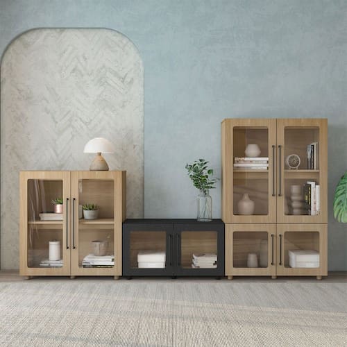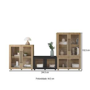 O(a) Conjunto Balcão Modulado Mia 8 Portas Riveira/Preto - Pnr Móveis é produzido em 100% MDF na escala de brilho Fosca com Textura, e possui um grau de dificuldade de montagem: Médio.