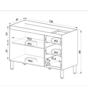 As dimensões estão expressas na seguinte forma - Largura x Altura e Profundidade em cm. O peso suportado considera a carga distribuída igualmente pela peça.