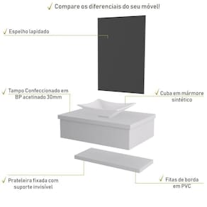 Sobre o ProdutoConjunto Bancada C/Cuba L30, Prateleira e Espelheira Metrópole 606 Branco ChessDescrição do Produto:O Conjunto (Bancada + Cuba + Espelheira + Prateleira) Metrópole KTME606 é um produto compacto de design simples e moderno, projetado para pequenos espaços, perfeito para fazer parte da decoração do seu lavabo ou banheiro. Conta com uma cuba de apoio, uma espelheira e prateleira com pinos invisíveis, além do suporte linha Metrópole é uma coleção de móveis modernos e com inúmeras possibilidades de composições, combinando design contemporâneo e muita funcionalidade. Diversas possibilidades de cores e modelos de cubas formam uma solução perfeita para as mais opções de decoração e projetos em ambientes de banheiro. É você quem decide!!!Itens Inclusos:1 Conjunto Bancada C/Cuba, Prateleira e EspelheiraDimensões dos Produtos:Bancada: 60 x 43 x 19 cmEspelheira: 43 x 1,8 x 60 cmCuba 29,8 x 29,8 x 11,5 cmInformações Logísticas (Comp. X Prof. X Alt.) 63 x 47 x 26 cm - Peso: 17,68 KgPeso Total: 17,68 KgObservações:Não acompanha acessórios decorativos. Imagens meramente ilustrativas.Informações Técnicas / Características:- Cor do Produto: Branco Chess- Cor do Predominante: Branco- Marca: Compace- Modelo: KTME606- Linha: Metrópole- Material: Mdp - Acabamento: Perffect Acetinado- Escala de Brilho: Fosco- Fita de Borda: Pvc - Possui Gavetas: Não - Material do Puxador: Alumínio- Possui Prateleiras: 1- Peso Máximo por Prateleira: 02 kg- Possui Pés: Não, suspenso - Possui Espelho: Sim - Acompanha Cuba / Lavatório: Sim, de Mármore Sintético- Furação para Cuba / Lavatório: Não- Tipo da Cuba: Apoio- Cor da Cuba: Branca- Suporta Até (kg): 12 kg - Peso Lí.: 16,78Kg- Recomendações de Uso, Manutenção e Limpeza: Para a limpeza, utilize flanela seca ou pano macio levemente umedecido em água. Utilize um pano seco em seguida. Evite com produtos químicos (solventes, thinner, acetona, etc) e não utilize nenhum tipo de esponja de aço.- Necessita de Montagem: Sim / Acompanha Manual de Montagem- Complexidade da Montagem: Média: pode ser montado por mais de uma pessoa e/ou necessite de maior conhecimento para montagem.- Garantia: 6 meses- Outras Características: Montagem ível, o suporte toalheiro pode ser montado em qualquer um dos lados. Material: Mdp | Acabamento: Perffect Acetinado | Escala de Brilho: Fosco | Fita de Borda: Pvc | Comprimento: 60 | Largura: 42 | Altura: 19 | Profundidade: 42 | Limite de unidades por venda: É possível comprar até 1 unidade por venda. | Quantidade máxima de pedido: 1 | Preço tabelado: 339 | Cor: Multicolorido | Certificação de teste externa: Não Aplicável | Baterias são necessárias?: false | Palavras-chave de Pesquisa: Não aplicável | Fonte de energia: Não aplicável | Fabricante: Compace | Is Fragile: | Peso do item: | Exige montagem: | Principais Características do Produto 2: | da peça: | Componentes incluídos: | Dimensões do item P x L x A: | Principais Características do Produto 1: | Principais Características do Produto 0: | do modelo: | de caixas: | Quantidade de itens: Cor: Branco Chess