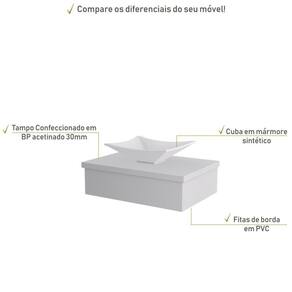 Sobre o ProdutoConjunto Bancada C/Cuba L38 Metrópole 600 Branco ChessDescrição do Produto:O Conjunto (Bancada + Cuba) Metrópole KTME600 é um produto compacto de design simples e moderno, projetado para pequenos espaços, perfeito para fazer parte da decoração do seu lavabo ou banheiro. Conta com uma cuba de apoio, além do suporte linha Metrópole é uma coleção de móveis modernos e com inúmeras possibilidades de composições, combinando design contemporâneo e muita funcionalidade. Diversas possibilidades de cores e modelos de cubas formam uma solução perfeita para as mais opções de decoração e projetos em ambientes de banheiro. É você quem decide!!!Itens Inclusos:1 Conjunto Bancada C/CubaDimensões dos Produtos:Bancada: 60 x 43 x 19 cmCuba 38,5 x 33 x 11,5 cmInformações Logísticas (Comp. X Prof. X Alt.) 63 x 47 x 26 cm - Peso: 11,55 KgPeso Total: 11,55 KgObservações:Não acompanha acessórios decorativos. Imagens meramente ilustrativas.Informações Técnicas / Características:- Cor do Produto: Branco Chess- Cor do Predominante: Branco- Marca: Compace- Modelo: KTME600- Linha: Metrópole- Material: Mdp - Acabamento: Perffect Acetinado- Escala de Brilho: Fosco- Fita de Borda: Pvc - Possui Gavetas: Não - Material do Puxador: Alumínio - Possui Pés: Não, suspenso - Possui Espelho: Não - Acompanha Cuba / Lavatório: Sim, de Mármore Sintético- Furação para Cuba / Lavatório: Não- Tipo da Cuba: Apoio- Cor da Cuba: Branca- Suporta Até (kg): 10 kg - Peso Lí.: 10,65Kg- Recomendações de Uso, Manutenção e Limpeza: Para a limpeza, utilize flanela seca ou pano macio levemente umedecido em água. Utilize um pano seco em seguida. Evite com produtos químicos (solventes, thinner, acetona, etc) e não utilize nenhum tipo de esponja de aço.- Necessita de Montagem: Sim / Acompanha Manual de Montagem- Complexidade da Montagem: Média: pode ser montado por mais de uma pessoa e/ou necessite de maior conhecimento para montagem.- Garantia: 6 meses- Outras Características: Montagem ível, o suporte toalheiro pode ser montado em qualquer um dos lados. Material: Mdp | Acabamento: Perffect Acetinado | Escala de Brilho: Fosco | Fita de Borda: Pvc | Tipo de Produto: Bancada para Banheiro | Fabricante: Compace | Comprimento: 60 | Largura: 42 | Limite de unidades por venda: É possível comprar até 1 unidade por venda. | Altura: 19 | Quantidade máxima de pedido: 1 | Profundidade: 42 | Preço tabelado: | Cor: Multicolorido | Certificação de teste externa: Não Aplicável | Baterias são necessárias?: false | Palavras-chave de Pesquisa: Não aplicável | Fonte de energia: Não aplicável | Peso do item: | Componentes incluídos: | Is Fragile: | Principais Características do Produto 1: | Principais Características do Produto 0: | Dimensões do item P x L x A: | Exige montagem: | da peça: | Principais Características do Produto 2: | do modelo: | de caixas: | Quantidade de itens: Cor: Branco Chess