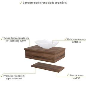 Sobre o ProdutoConjunto Bancada C/Cuba L42 e Prateleira Metrópole 605 Branco ChessDescrição do Produto:O Conjunto (Bancada + Cuba + Prateleira) Metrópole KTME605 é um produto compacto de design simples e moderno, projetado para pequenos espaços, perfeito para fazer parte da decoração do seu lavabo ou banheiro. Conta com uma cuba de apoio e uma prateleira com pinos invisíveis, além do suporte linha Metrópole é uma coleção de móveis modernos e com inúmeras possibilidades de composições, combinando design contemporâneo e muita funcionalidade. Diversas possibilidades de cores e modelos de cubas formam uma solução perfeita para as mais opções de decoração e projetos em ambientes de banheiro. É você quem decide!!!Itens Inclusos:1 Conjunto Bancada C/Cuba e PrateleiraDimensões dos Produtos:Bancada: 60 x 43 x 19 cmCuba 44,5 x 31 x 14,5 cmInformações Logísticas (Comp. X Prof. X Alt.) 63 x 47 x 26 cm - Peso: 15,92 KgPeso Total: 15,92 KgObservações:Não acompanha acessórios decorativos. Imagens meramente ilustrativas.Informações Técnicas / Características:- Cor do Produto: Branco Chess- Cor do Predominante: Branco- Marca: Compace- Modelo: KTME605- Linha: Metrópole- Material: Mdp - Acabamento: Perffect Acetinado- Escala de Brilho: Fosco- Fita de Borda: Pvc - Possui Gavetas: Não - Material do Puxador: Alumínio- Possui Prateleiras: 1- Peso Máximo por Prateleira: 02 kg- Possui Pés: Não, suspenso - Possui Espelho: Não - Acompanha Cuba / Lavatório: Sim, de Mármore Sintético- Furação para Cuba / Lavatório: Não- Tipo da Cuba: Apoio- Cor da Cuba: Branca- Suporta Até (kg): 12 kg - Peso Lí.: 15,02Kg- Recomendações de Uso, Manutenção e Limpeza: Para a limpeza, utilize flanela seca ou pano macio levemente umedecido em água. Utilize um pano seco em seguida. Evite com produtos químicos (solventes, thinner, acetona, etc) e não utilize nenhum tipo de esponja de aço.- Necessita de Montagem: Sim / Acompanha Manual de Montagem- Complexidade da Montagem: Média: pode ser montado por mais de uma pessoa e/ou necessite de maior conhecimento para montagem.- Garantia: 6 meses- Outras Características: Montagem ível, o suporte toalheiro pode ser montado em qualquer um dos lados. Material: Mdp | Acabamento: Perffect Acetinado | Escala de Brilho: Fosco | Fita de Borda: Pvc | Tipo de Produto: Bancada para Banheiro | Fabricante: Compace | Comprimento: 60 | Limite de unidades por venda: É possível comprar até 1 unidade por venda. | Largura: 42 | Quantidade máxima de pedido: 1 | Altura: 19 | Profundidade: 42 | Preço tabelado: | Cor: Multicolorido | Certificação de teste externa: Não Aplicável | Baterias são necessárias?: false | Palavras-chave de Pesquisa: Não aplicável | Fonte de energia: Não aplicável | da peça: KTME605 | Exige montagem: | Componentes incluídos: | Is Fragile: | Principais Características do Produto 2: | Principais Características do Produto 1: | Principais Características do Produto 0: | Dimensões do item P x L x A: | Peso do item: | de caixas: | Quantidade de itens: | do modelo: Cor: Nogal