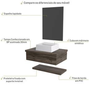 Sobre o ProdutoConjunto Bancada C/Cuba Q32, Prateleira e Espelheira Metrópole 606 Branco ChessDescrição do Produto:O Conjunto (Bancada + Cuba + Espelheira + Prateleira) Metrópole KTME606 é um produto compacto de design simples e moderno, projetado para pequenos espaços, perfeito para fazer parte da decoração do seu lavabo ou banheiro. Conta com uma cuba de apoio, uma espelheira e prateleira com pinos invisíveis, além do suporte linha Metrópole é uma coleção de móveis modernos e com inúmeras possibilidades de composições, combinando design contemporâneo e muita funcionalidade. Diversas possibilidades de cores e modelos de cubas formam uma solução perfeita para as mais opções de decoração e projetos em ambientes de banheiro. É você quem decide!!!Itens Inclusos:1 Conjunto Bancada C/Cuba, Prateleira e EspelheiraDimensões dos Produtos:Bancada: 60 x 43 x 19 cmEspelheira: 43 x 1,8 x 60 cmCuba 33 x 30 x 10 cmInformações Logísticas (Comp. X Prof. X Alt.) 63 x 47 x 26 cm - Peso: 19,25 KgPeso Total: 19,25 KgObservações:Não acompanha acessórios decorativos. Imagens meramente ilustrativas.Informações Técnicas / Características:- Cor do Produto: Branco Chess- Cor do Predominante: Branco- Marca: Compace- Modelo: KTME606- Linha: Metrópole- Material: Mdp - Acabamento: Perffect Acetinado- Escala de Brilho: Fosco- Fita de Borda: Pvc - Possui Gavetas: Não - Material do Puxador: Alumínio- Possui Prateleiras: 1- Peso Máximo por Prateleira: 02 kg- Possui Pés: Não, suspenso - Possui Espelho: Sim - Acompanha Cuba / Lavatório: Sim, de Mármore Sintético- Furação para Cuba / Lavatório: Não- Tipo da Cuba: Apoio- Cor da Cuba: Branca- Suporta Até (kg): 12 kg - Peso Lí.: 18,35Kg- Recomendações de Uso, Manutenção e Limpeza: Para a limpeza, utilize flanela seca ou pano macio levemente umedecido em água. Utilize um pano seco em seguida. Evite com produtos químicos (solventes, thinner, acetona, etc) e não utilize nenhum tipo de esponja de aço.- Necessita de Montagem: Sim / Acompanha Manual de Montagem- Complexidade da Montagem: Média: pode ser montado por mais de uma pessoa e/ou necessite de maior conhecimento para montagem.- Garantia: 6 meses- Outras Características: Montagem ível, o suporte toalheiro pode ser montado em qualquer um dos lados. Material: Mdp | Acabamento: Perffect Acetinado | Escala de Brilho: Fosco | Fita de Borda: Pvc | Comprimento: 60 | Largura: 42 | Altura: 19 | Limite de unidades por venda: É possível comprar até 1 unidade por venda. | Profundidade: 42 | Preço tabelado: | Quantidade máxima de pedido: 1 | Cor: Multicolorido | Certificação de teste externa: Não Aplicável | Baterias são necessárias?: false | Palavras-chave de Pesquisa: Não aplicável | Fonte de energia: Não aplicável | Fabricante: Compace | Exige montagem: | Is Fragile: | Componentes incluídos: | Principais Características do Produto 0: | Peso do item: | Dimensões do item P x L x A: | Principais Características do Produto 1: | Principais Características do Produto 2: | da peça: | Quantidade de itens: | do modelo: | de caixas: Cor: Carvalho Dark
