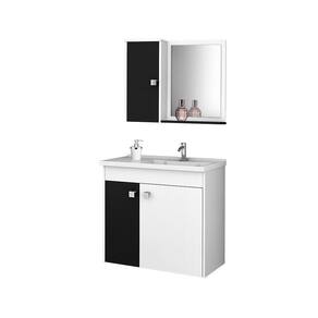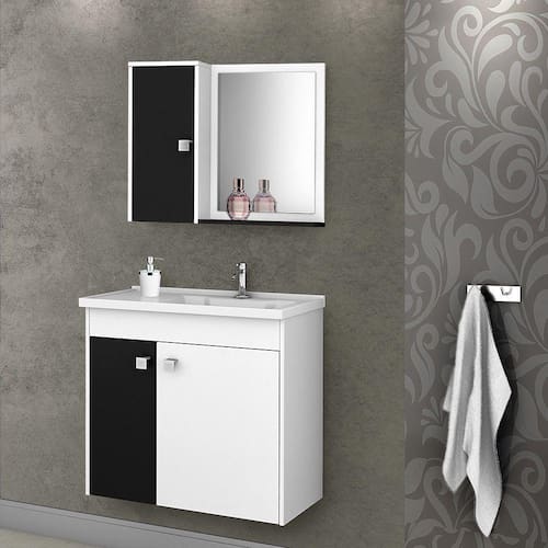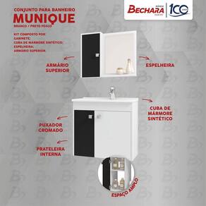 O Conjunto para Banheiro Munique composto por lavatório em mármore sintético, armário superior, espelheira e gabinete, elaborado em MDF com espessura de 12 mm. Pintura da superfície em verniz poliéster semi-brilho, com secagem UV e impressão a laser, com acabamento com textura em alto relevo, destacando os veios da madeira com cores mais próximas às naturais. Acabamento nas bordas com fita de papel decorativo aplicado mecanicamente por sistema hot melting. Puxadores de plástico com acabamento cromado, dobradiças metálicas. Ele é tudo o que falta para o seu banheiro ficar completo!