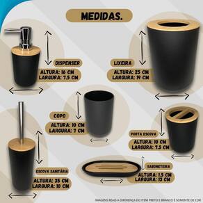 Conjunto de banheiro 6 peças com acabamento de bamboo ideal para presente Kit de banheiro 6 peças Mantenha sua casa organizada e limpa com o conjunto de 6 peças. Com um design elegante na cor preto ou branca, é ideal para quem busca praticidade e eficiência. Compacto e funcional, eles se adaptam perfeitamente a diferentes ambientes, seja na cozinha, escritório ou área externa. A qualidade e a resistência do material garantem durabilidade e uso prolongado. Enviada cor disponivel em Conteúdo da embalagem 6 x peças para banheiro Enviada cor disponivel em Características Cor: preto ou branca Número da peça: 6 peças Número de unidades: 6 Enviada cor disponivel em Especificações Dimensões da embalagem: 27,5 x 20 x 20 cm Dimensões do pacote: 27.5 x 20 x 20 centímetros Enviada cor disponivel em Não perca a chance de manter sua casa em ordem adquira agora o conjunto banheiro 6 peças e traga mais organização e estilo para o seu dia a dia Marca: Não Informado Ean: 7905560911106
