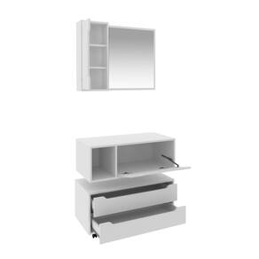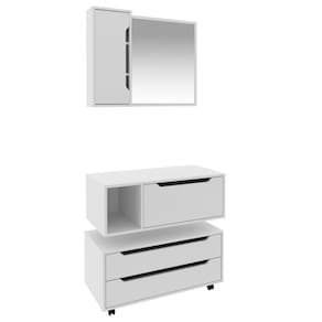 O Conjunto Banheiro com Gabinete Suspenso 1 Gaveta Espelheira Armário com Rodízio Tecno Mobili, possui 1 porta com frente usinada, tampo e nicho lateral. Estrutura em MDP e acabamento em pintura UV e partes em BP. O produto não acompanha cuba. Possui 1 porta com frente usinada, espelho de 560x505x3mm e 3 prateleiras internas. Estrutura em MDP e acabamento em pintura UV e partes em BP. Montagem reversível, podendo ser montado para ambos os lados. Possui 2 gavetas com frente usinada, tampo e rodízio que permite movimento. Estrutura em MDP e acabamento em pintura UV e partes em BP. Imagem meramente ilustrativa. A decoração do ambiente não acompanha o produto. O produto será entregue desmontado.