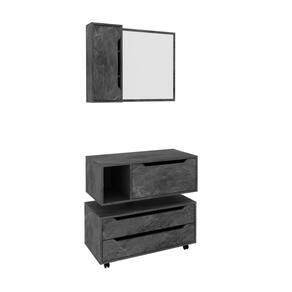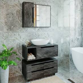 O Conjunto Banheiro com Gabinete Suspenso 1 Gaveta Espelheira Armário com Rodízio Tecno Mobili, possui 1 porta com frente usinada, tampo e nicho lateral. Estrutura em MDP e acabamento em pintura UV e partes em BP. O produto não acompanha cuba. Possui 1 porta com frente usinada, espelho de 560x505x3mm e 3 prateleiras internas. Estrutura em MDP e acabamento em pintura UV e partes em BP. Montagem reversível, podendo ser montado para ambos os lados. Possui 2 gavetas com frente usinada, tampo e rodízio que permite movimento. Estrutura em MDP e acabamento em pintura UV e partes em BP. Imagem meramente ilustrativa. A decoração do ambiente não acompanha o produto. O produto será entregue desmontado.
