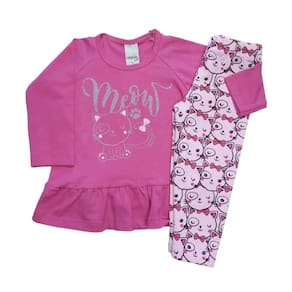 Blusa em malha com estampa frontal manga longa e babado na parte inferior, botão de pressão na gola para facilitar no momento de vestir o bebê. Em malha 96% algodão e 4% elastano. Calça legging em molecotton peluciado com elástico no cós. Malha estampada na cor rosa, estampa de gatinhos. Confortável e quentinha para curtir a brincadeira ou o passeio. Malha 83% algodão, 11% poliéster e 6% elastano. Ideal para dias mais amenos.