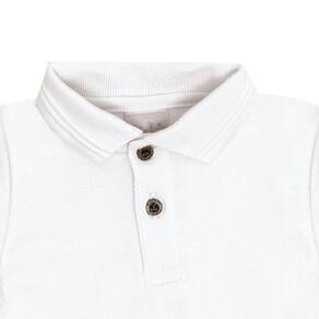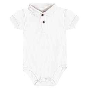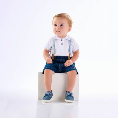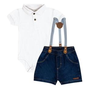 Um verdadeiro baby cavalheiro! Conjunto composto por um body em suedine na cor branca e gola polo com abertura de botões frontais e entre as pernas para facilitar a troca e a movimentação. A bermuda jeans leve na cor índigo escuro possuí suspensório deixando o look uma graça pra encantar a todos onde estiver.