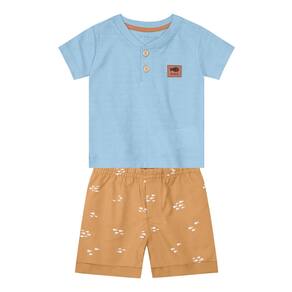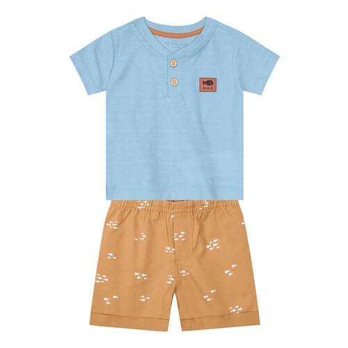 Conjunto bebê menino composto por camiseta e bermuda. A camiseta confeccionada em malha maquinetada possui decote redondo com abertuta de gola por botões, mangas curtas e aplique patch decorativo, já a bermuda em sarja comfort conta com estampa rotativa e elástico no cós. Este conjunto é perfeito para diversas ocasiões, desde passeios descontraídos até brincadeiras no parque. Invista!