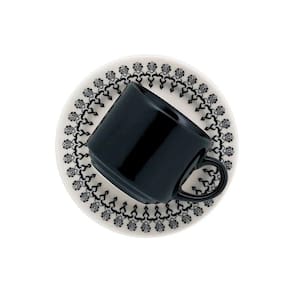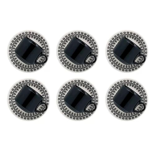 Conjunto Biona 12 Peças Xícaras + Pires Donna Folk 180ml A cor preta é básica e neutra, um verdadeiro curinga na hora de montar a mesa. Nessa louça, colocamos a cor preta numa estampa mais alegre e jovial, perfeita para quem prefere um formato de pratos tradicional com uma decoração mais alegre. A xícara preta, sem decoração, cria uma linda composição com os pires.