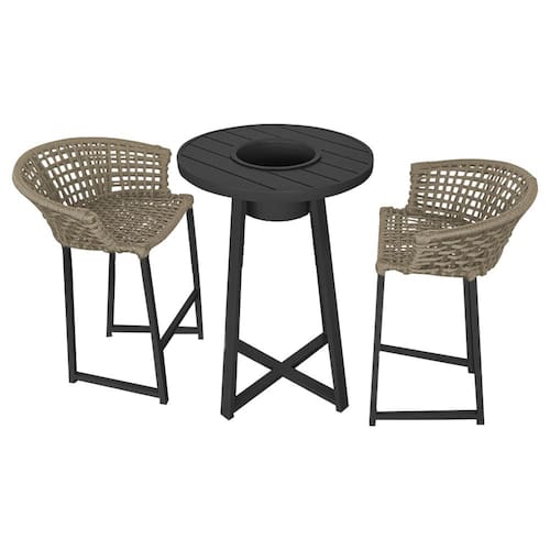 Características Tipo: Conjunto Modelo: Mesa Bistrô Champanheira Cor: Preto Modelo: Banqueta Reis Cor base: Preto Cor corda: Rami