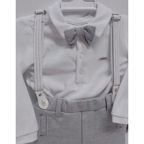 - Suspensório de elástico, metal e courino. Pode ser removido e utilizado com outros looks.