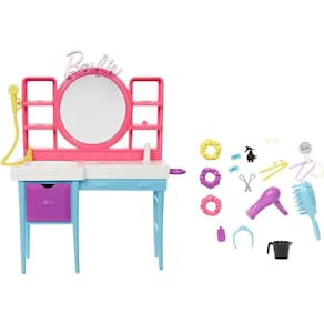 Entre no salão da Barbie para horas de diversão com penteados! Este conjunto Barbie Salão de Beleza inspira narrativas criativas e de faz-de-conta com penteadeira, mais de 15 acessórios e boneca com cabelo que muda de cor