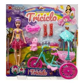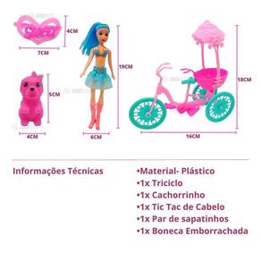 Conjunto boneca com triciclo com 5 peças cor contém: 1 boneca, 1 triciclo, 1 cachorrinho e 2 acessórios cores composição: plástico produto não recomendado para menores de 3 anos atenção: imagem meramente ilustrativa. Pode ocorrer mudanças no tom da cor da tela do celular/pc para o produto real ou mudanças na embalagem do produto sem aviso prévio por parte do fabricante. Homologação Inmetro: 3818/2018-BRI-2 Marca: Não Informado