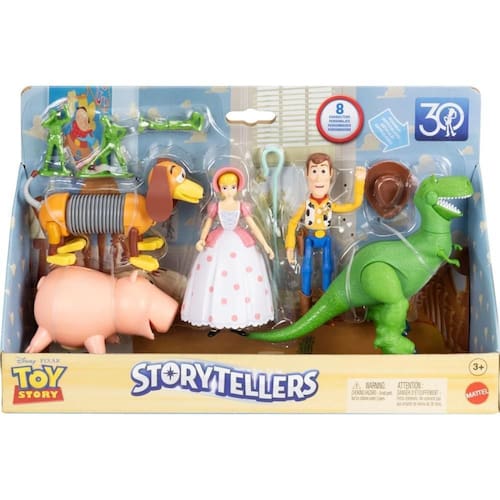 Coleção com 8 Personagens Toy Story - Disney Pixar - Storytellers - Mattel é uma linha que comemora 30 anos de Toy Story da Disney e Pixar com este pacote Storytellers com 5 personagens em escala de 10 cm: Woody, Rex, Slinky Dog, Ham e Bo Peep, além de 3 bonecos pequenos dos Homenzinhos Verdes. É fácil recriar várias cenas do filme imediatamente com esta coleção instantânea de brinquedos de personagens com design autêntico. Os Homenzinhos Verdes têm 3 cm de altura e os outros bonecos variam de 5 a 12 cm. Um ótimo presente para fãs de Toy Story a partir de 4 anos.