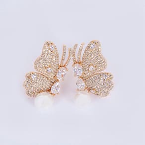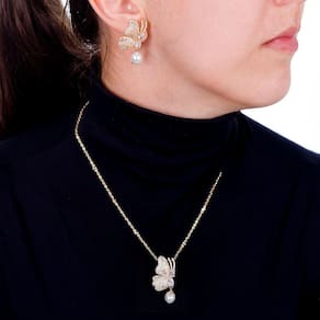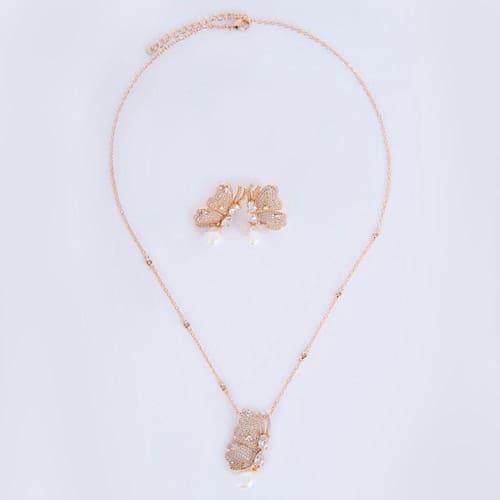 O Conjunto é composto por um colar e um par de brincos banhados a ouro com aplicação de pérolas e zircônias cristais. É delicado e luxuoso que te deixa em destaque em qualquer situação.