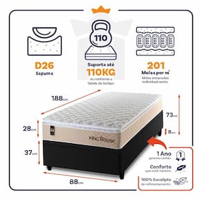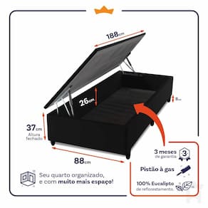 - Altura: 28 cm (colchão) + 37 cm (box baú) + 8 cm (pés) = 73 cm de altura;