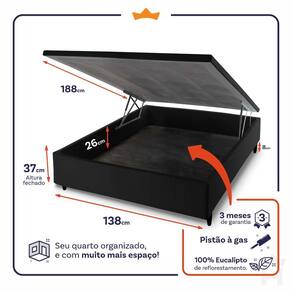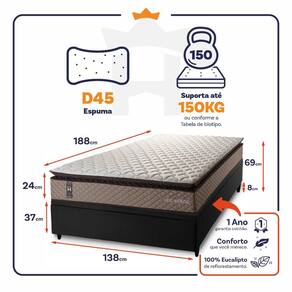 - Altura: 24 cm (colchão) + 37 cm (box baú) + 8 cm (pés) = 69 cm de altura;