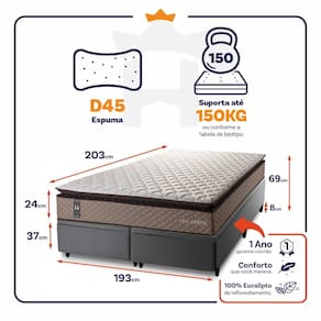 - Altura: 24 cm (colchão) + 37 cm (box baú) + 8 cm (pés) = 69 cm de altura;