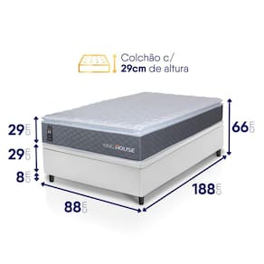 - Altura: 66 cm (colchão) + 8 cm (box) = 74 cm de altura;