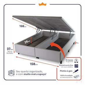 - Altura: 35 cm (colchão) + 37 cm (box baú) + 8 cm (pés) = 80 cm de altura;