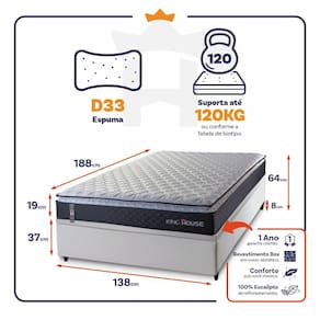 O Colchão Dakota é feito com os mais nobres materiais em sua composição, ele conta com espuma D33. Por ser mais macio, o colchão traz benefícios e ajuda no alinhamento da coluna. O colchão King House acomoda melhor o contorno do corpo, dispondo de forma correta quadris e ombros, expulsando as dores e problemas de coluna.