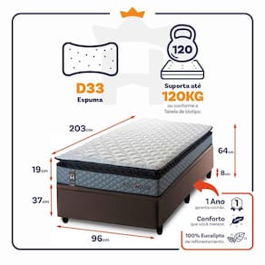 - Altura: 19 cm (colchão) + 37 cm (box baú) + 8 cm (pés) = 64 cm de altura;