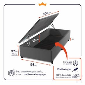 - Altura: 19 cm (colchão) + 37 cm (box baú) + 8 cm (pés) = 64 cm de altura;