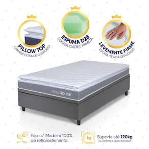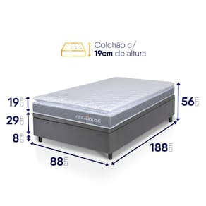 - Altura: 56 cm (colchão) + 8 cm (box) = 64 cm de altura;